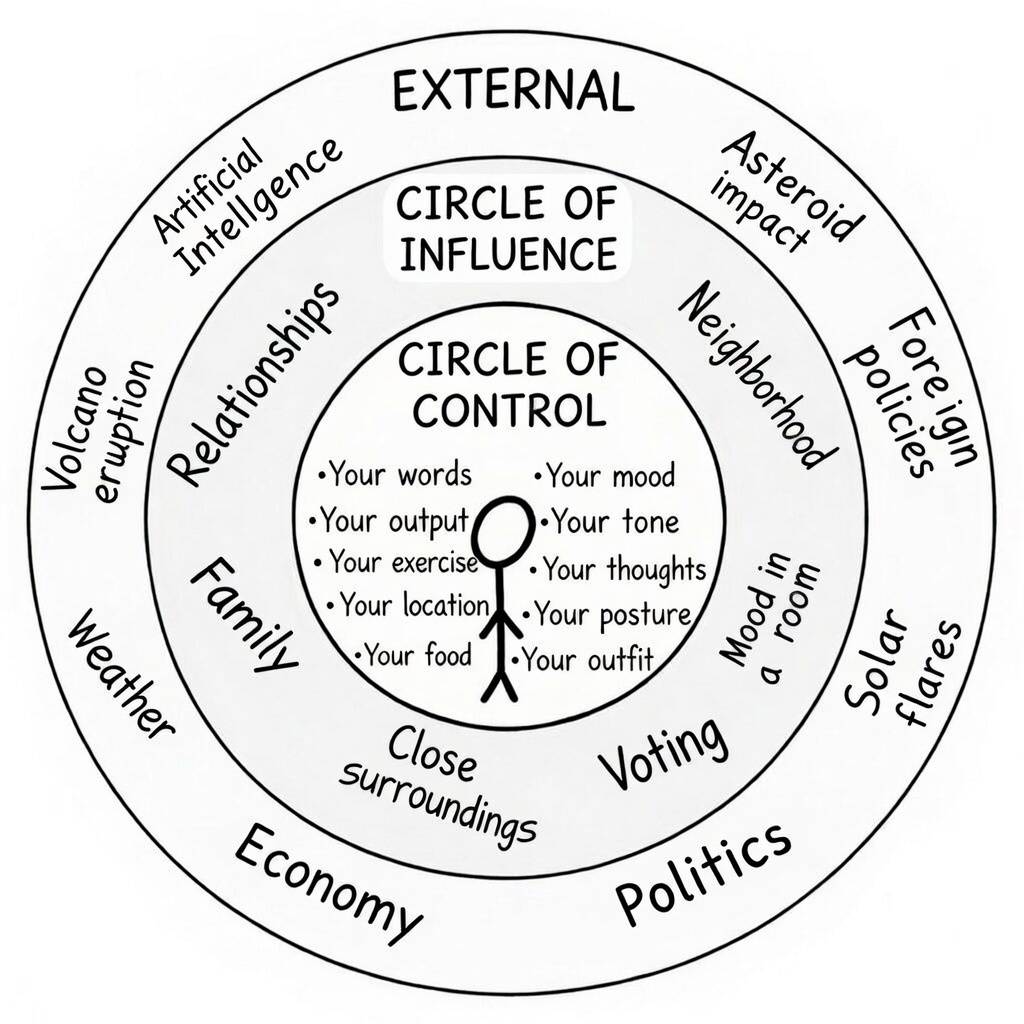 Hey friend- The world is a heavy place. I like to think about all the things that impact us as items in our metaphoical backpacks. Your backpack holds the weight of AI disruption, the weather, macroeconomics, taxes, politics, etc. The things in the outer circle outlined below are beyond your control, yet they shape everything you do in different ways. I first saw this concept via Neville Medhora and adapted it. Credit to Neville. This circle framework is very helpful for understanding what...