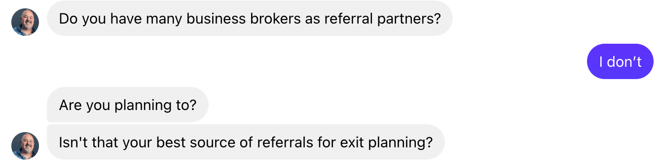 Hey friend, I went to a conference in Orlando in 2016 and met a friend of a friend. That friend of a friend's name is Dan Kalis. Dan recently reached out to me and said, "Hey, I have a new product, and I think you'd be a good first customer for it." He noticed that many company pages have only brief bios, since talking about oneself feels awkward. He's developed a product that lets you tell your life story from a business angle in a 'BIOcumentary. ' I'm always happy to help a friend, and I also thought it would be a fun chance to share my story. Here's how it turned out: I got this video a week ago, and immediately after, I got really sick for 7 days. While sick, Dan and I were chatting on Messenger. He sent me the following message last Thur night: This simple accountability message was what I needed as a kick in the butt to start developing more relationships with business brokers. Here's what happened as a result of that simple message: